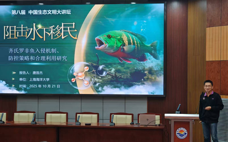 上海海洋大学唐首杰在报告中指出,齐氏罗非鱼已成为我国南方水体中破坏力较强的外来入侵鱼类,广泛分布于多个重要水域,在强光、高温环境下易形成高密度种群,威胁本土鱼类与生态系统安全。为此,赵金良团队构建了一套综合防控体系,通过系统采样和MaxEnt模型预测罗非鱼适生区域,推动eDNA技术用于早期预警和监测,并探索将捕获的罗非鱼资源化利用于水环境治理,形成“防控-利用”闭环技术。唐首杰进一步指出,通过协助地方政府制定防控行动计划,推动公众参与社会监督,实现全流程防控,可有效阻击外来鱼类入侵。