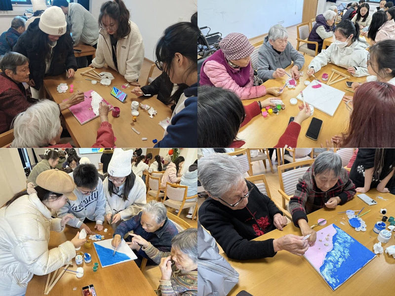 “创意贝壳画”手工环节,学员们与老人结对而坐,共同执笔、拼贴、涂绘。一片片贝壳在指尖翻转,一点点色彩在画板上晕染,老人们在学生的协助下,拼出灵动的贝壳与海星,绘出礁石与浪花,还将夕阳与海鸥点缀其间,渐渐勾勒出心中的那片海。过程中,学员们轻声讲解、耐心陪伴,老人们也讲述起自己的往事与感悟。一老一少,笑语盈盈,画面温馨动人。