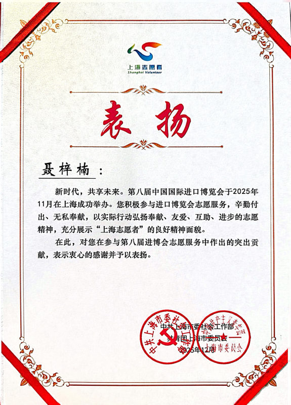 在第八届中国国际进口博览会志愿服务舞台上,聂梓楠以多重身份扛起责任,用细致服务传递温度。从十月份进博会组织统筹,到十一月份为期五天的会期服务,聂梓楠将“奉献、友爱、互助、进步”的志愿精神融入每一项工作。从物资管控到现场服务,从岗前筹备到应急处置,她都以扎实的行动、出色的能力展现了新时代大学生志愿者的卓越风采,成为进博会志愿服务的典型标杆。