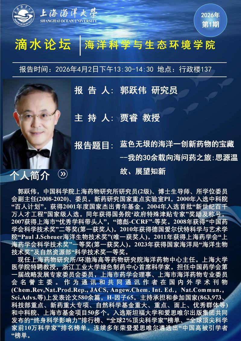 【讲座预告】蓝色无垠的海洋一创新药物的宝藏 ——我的30余载向海问药之旅:思源温故、展望知新