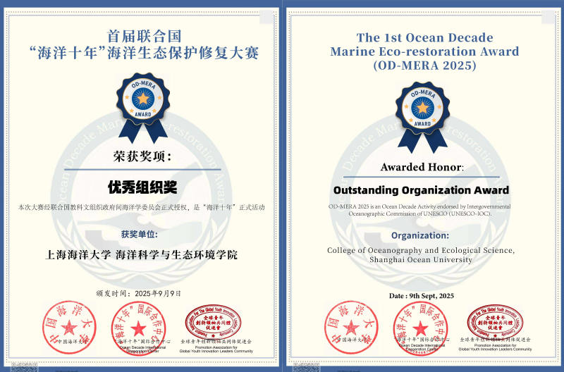 近日,上海海洋大学海洋科学与生态环境学院在首届联合国“海洋十年”海洋生态保护修复大赛中荣获优秀组织奖。首届联合国“海洋十年”海洋生态保护修复大赛于2025年6月启动,校内选拔赛由校团委牵头,海科学院组织,学校共有4个项目获得重点立项。