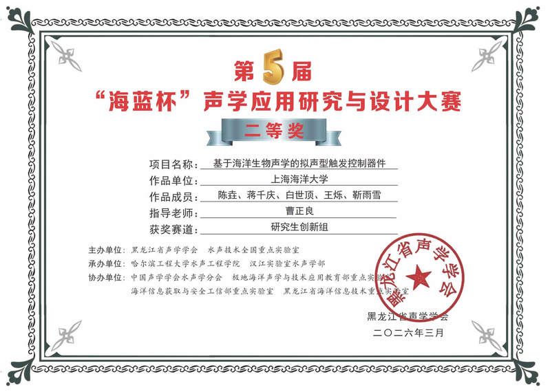 近日,第五届“海蓝杯”声学应用研究与设计大赛决赛在三亚市崖州区创新研学谷落幕。上海海洋大学海洋科学与生态环境学院曹正良指导的项目《基于海洋生物声学的拟声型触发控制器件》荣获第五届 “海蓝杯” 声学应用研究与设计大赛二等奖。